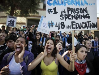 「カリフォルニア州の支出は、刑務所が第1位、教育が第48位」と弾劾するプラカード