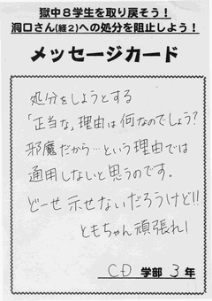 学生をモノのように扱い、抗議すれば処分・逮捕。もはやこんな大学、社会に未来などない。学生は黙って従う存在ではない。学生の団結には無限の可能性がある。学生が団結すればどれほどのことができるかを示してきたのが文連3役をはじめ獄中8学生だ。そして8人は今や、教育の民営化と闘う世界の学生のリーダーだ。洞口さんの処分を許さない団結で、今すぐ8人をとり戻そう!