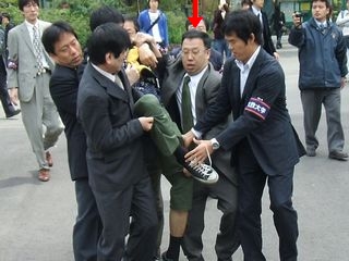 今年も連日登場している矢印の男はキャリアセンター(以前の就職部)次長の勝又秀雄(異動してなければ)。写真の場面で、真っ先に足をつかみ上げたのもこの男です。現在も、菅野らと並んで、真っ先に手を出してくることで有名ですが、「法政大学第一職員組合」の委員長をやっていたことでも有名です。