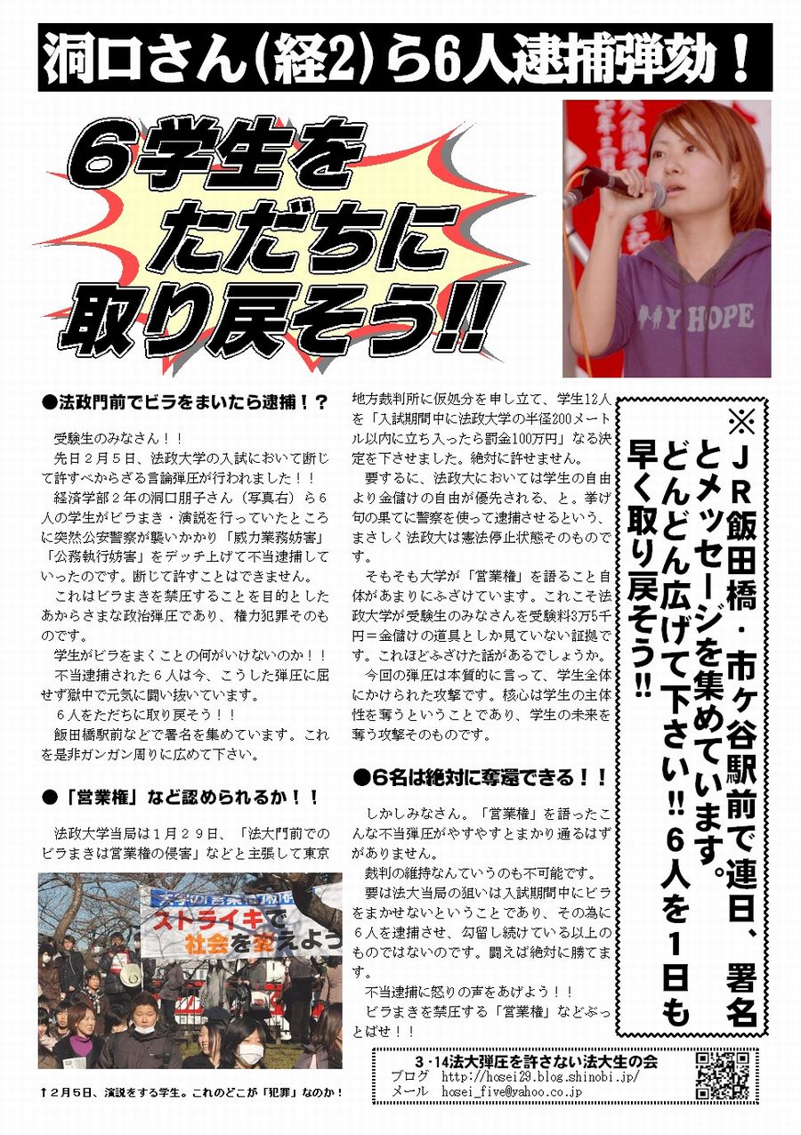 要は法大当局の狙いは入試期間中にビラをまかせないということであり、その為に6人を逮捕させ、勾留し続けている以上のものではないのです。闘えば絶対に勝てます。