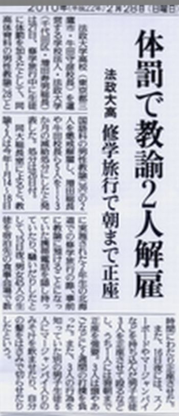 しかし、ちょっと待て! 法大当局は、そもそも1月下旬に修学旅行での「暴行事件」が発覚して、「教育のあり方を見直す」と謝罪したばかりである。その間に起きたことは、法大においては、キャンパス全面飲酒規制であり、学生処分策動であり、2・5法大入試弾圧での6学生の逮捕だ。確かに、学生に暴力をふるった教師(=教育労働者だ!)はナンセンスだ。しかし、真っ先に辞職すべきは、学生管理を真っ先でやってきた法大総長・増田であり、理事会だ。減給でお茶を濁すことなど許さない! 一体、理事達はいくら給料もらってるんだ! そして、暴力をふるい、110番通報した職員こそ、やめさせ、法大から追放すべきなのだ。