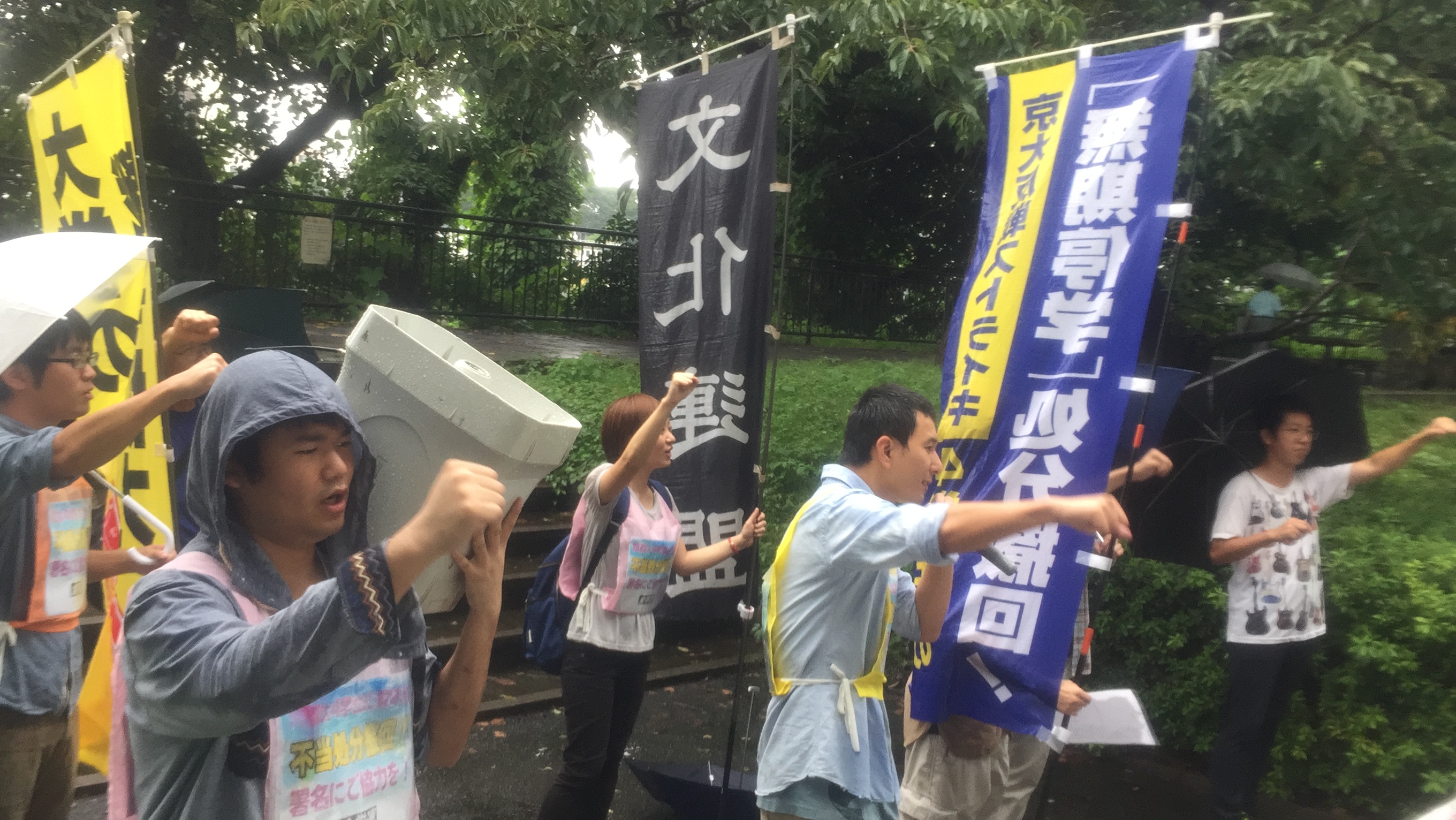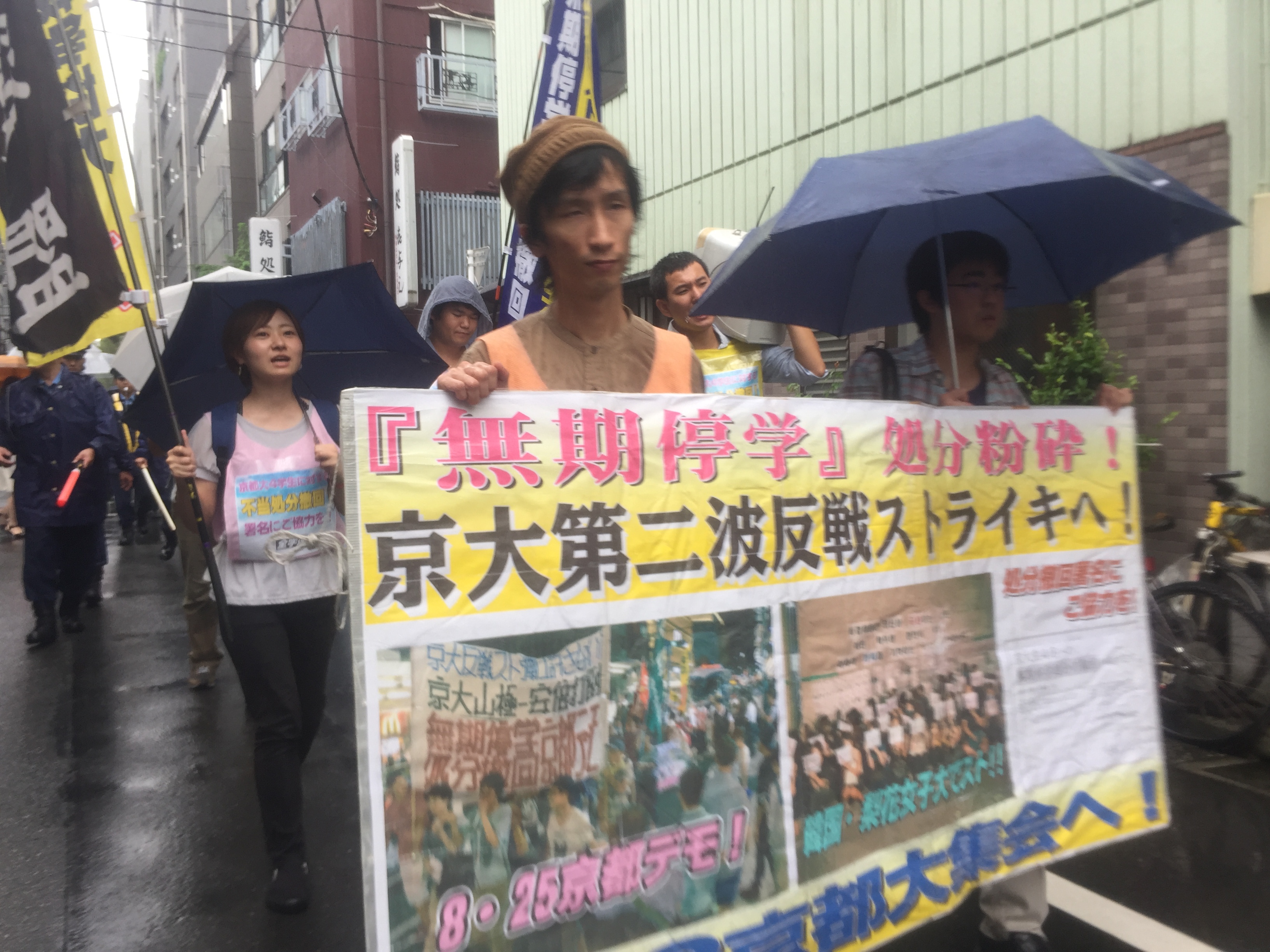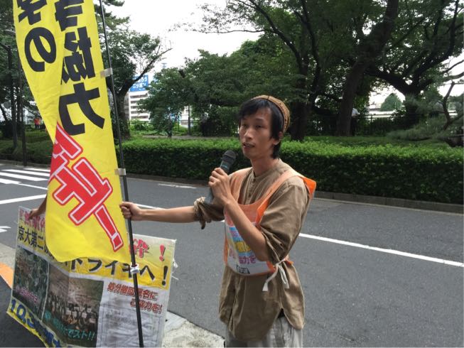 法政大学文化連盟委員長・武田雄飛丸君は、「本日のデモは、大学から政治を取り戻すためのデモです。京大反戦バリケードストライキを闘った京大4学生にかけられた無期停学処分を撤回させよう!韓国やフランスなど、全世界で学生・労働者がストライキやゼネストに立ち上がっています。『大学では闘わない』シールズ運動を乗り越えて、今こそキャンパスからストライキに立ち上がろう!」と訴えました。