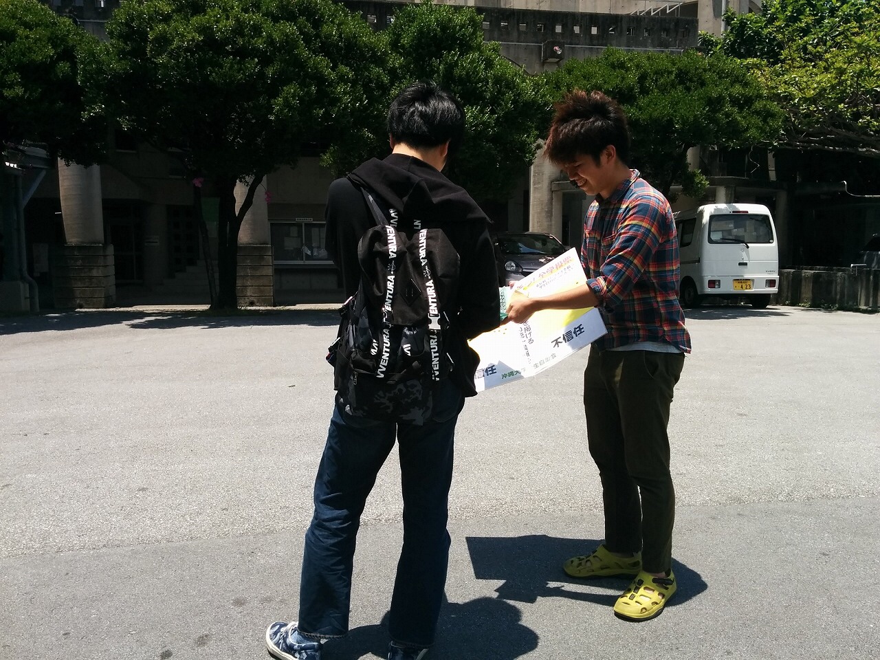 連日の闘いお疲れ様です。今日は朝の置きビラを332枚まくことができました。19日の時点で合計投票数は52票です。信任が46票、不信任が6票です。今日は1年生から「頑張ってください」とメッセージを貰いました。そして赤嶺くんの立候補に続き、沖大生・上門くんが副委員長に立候補しました!去年の5.15沖大キャンパス集会で発言してくれた学生です。4人に1人が辞めていく学生の貧困の現実を打ち破る決起が起こっています。盛島くんも上門くんが統一候補に立候補したことを電話で知り、激励の言葉をかけてくれました。