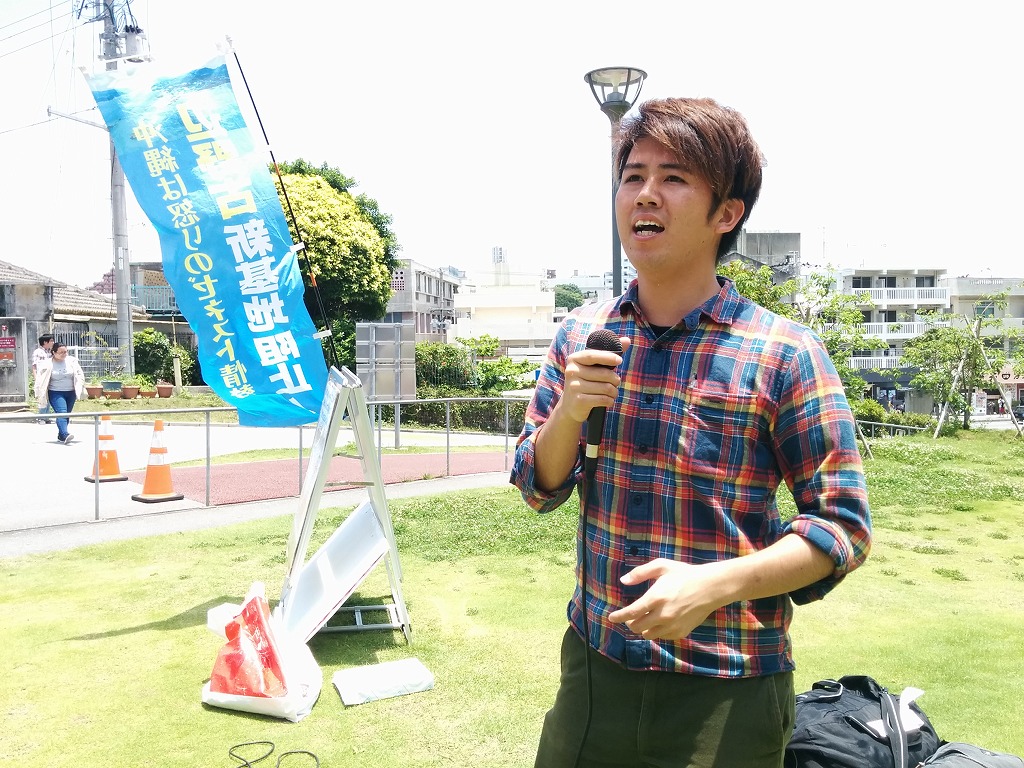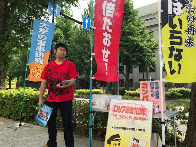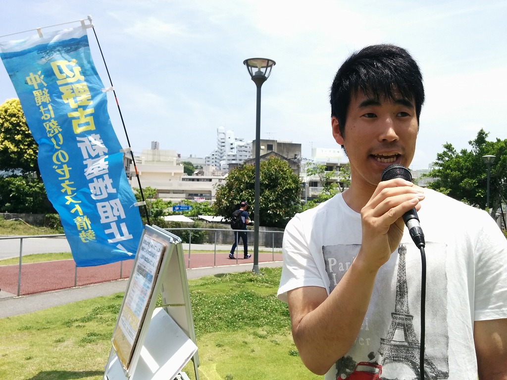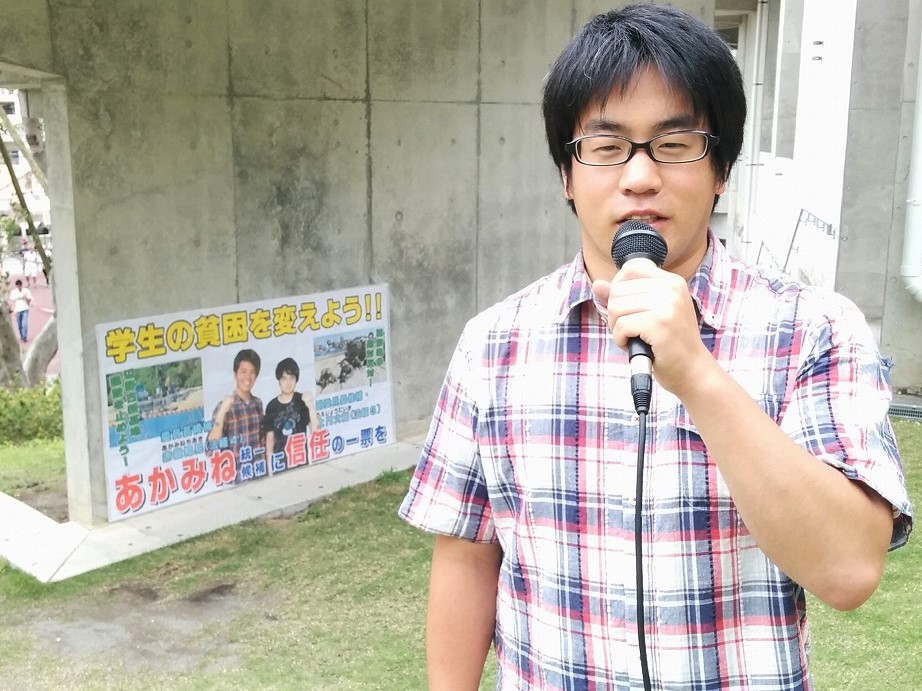 赤嶺くんが一年間闘い続け、「赤嶺くんが頑張っているから」と投票してくれる学生が多くいました。元気よく登場することが沖大生の決起を生み、団結を生んでいます。沖大学生自治会は3年経ちました。年々職員の妨害を打ち破り反動を打ち破って、学生の思いに応えることが改憲と戦争と共謀罪を粉砕する道です。京大生が参加し、キャンパス中央で応援演説を行うなど、全国の学生の決起を通じて勝利の道を歩んでいます。