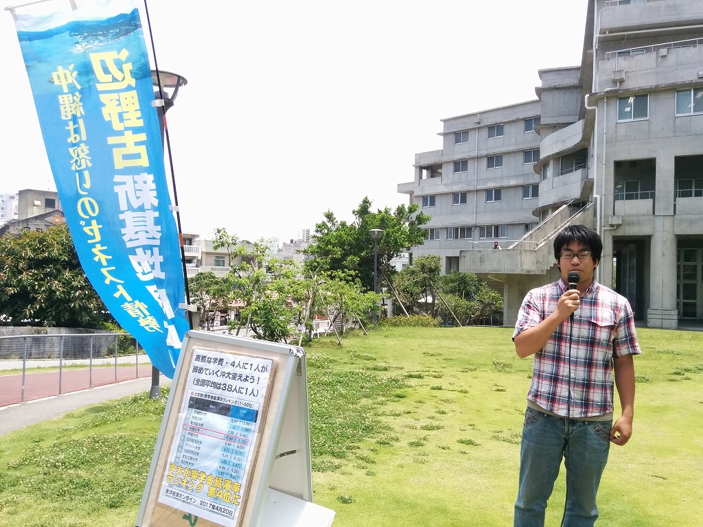 特に5限目の留学生のクラスでは、ハッキリと分岐が起きました。赤嶺くんが訴えて僕が応援演説をしたんですが「俺も立候補しようかな〜」と言う学生がいました。その学生は「拡声器を使わせないと立候補すれば絶対勝つわ〜」と明らかに反動的な学生でした。授業時間が来て教室にでる学生と教室に残る学生に分かれ、教室に残った学生は拍手をしてくれました。後でその学生は沖大学生自治会に対抗して大学が作った学生「自主」サークルに所属している学生だと分かりました。こういう反動学生も粉砕しながら勝利していっていることはかなり重要だと思います。